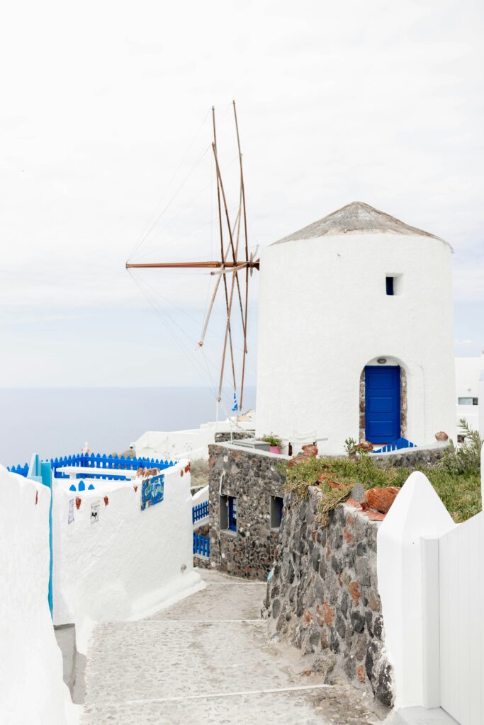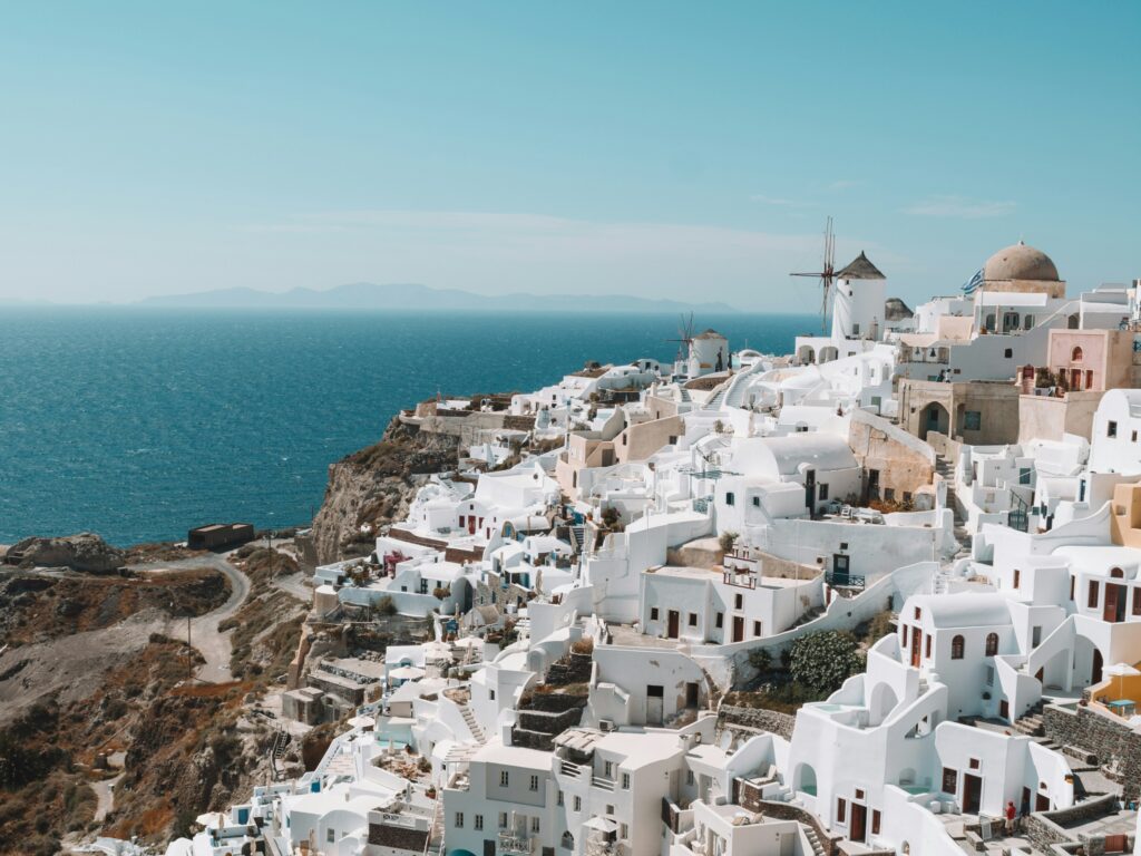 青いドーム屋根の教会や、風車、白壁の家々が密集する風景は、まさに絶景。